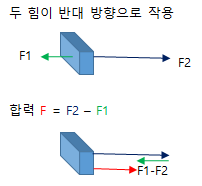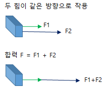 두 힘이 같은 방향으로 작용할 경우, 합력의 크기는 두 힘의 합이다. 두 힘이 반대 방향으로 작용할 경우, 합력의 크기는 두 힘의 차이다.